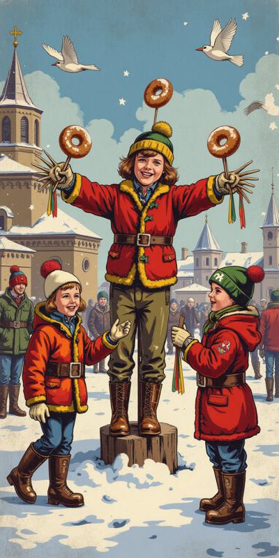 A festive fair scene in the style of Boris Kustodiev: children and adults joyfully celebrate amidst a snowy landscape with ancient Russian architecture in the background. In the center, a colorful scarecrow adorned with bright ribbons symbolizes the end of winter. Children hold bagels and fluttering ribbons, their poses dynamic and full of movement. Vibrant, saturated colors; soft, warm shadows; clear, expressive lines. The sky is bright and cloudless, enhancing the festive atmosphere. Rich details: patterned scarves, wooden stalls, snow-dusted roofs. Watercolor, 9:16.