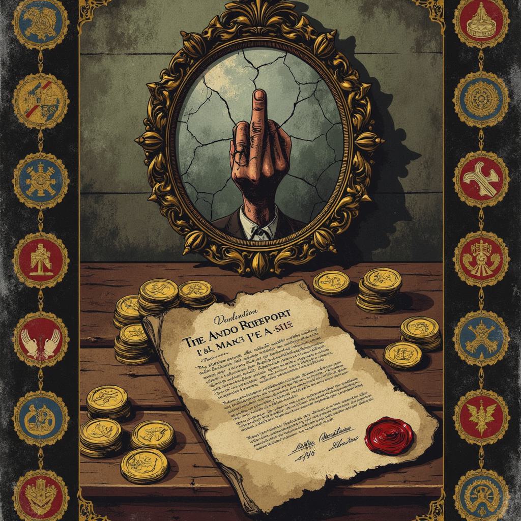 Обложка академического журнала в стиле тёмного фэнтези. На переднем плане — старинный пергаментный контракт с печатями, лежащий на стопке золотых монет. Над ним парит треснувшее зеркало, в отражении которого видна не человеческая фигура, а сложный механизм из шестерёнок. По краям — эмблемы гильдий Греата: стальной коготь, агатовый кристалл, золотое колесо. Всё освещено холодным светом, падающим из окна на каменную стену библиотеки. Стиль детализированной цифровой живописи, атмосфера интеллектуального цинизма и усталой мудрости, тёмная цветовая палитра с акцентами золота и пергамента.