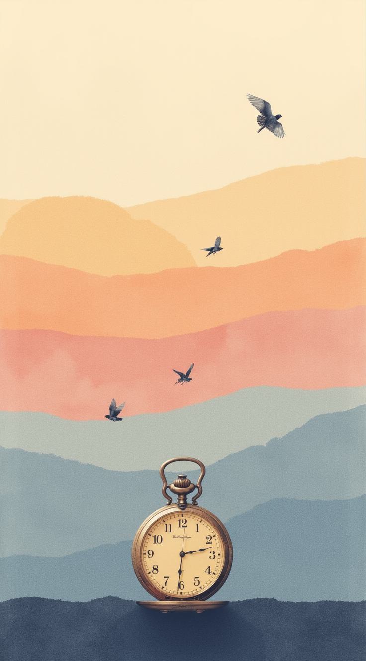 Природа и время, , Фон: акварельный закат или рассвет с мягкими полосами оранжевого, розового и голубого., , Центральный элемент: старинное карманное часовое, слегка размытое, с видимыми стрелками, показывающими «без пяти шесть» (символ юности и начала пути)., , Детали: вокруг часов — летящие лепестки цветов или листья; внизу — тонкая ветка с почками или распускающимися цветами., , Текст: название «Мелодия юности» шрифтом с лёгким рукописным уклоном в тёплых золотистых тонах; имя автора — внизу, мелким шрифтом в сером или коричневом., , Настроение: ностальгия, течение времени, красота мгновения.