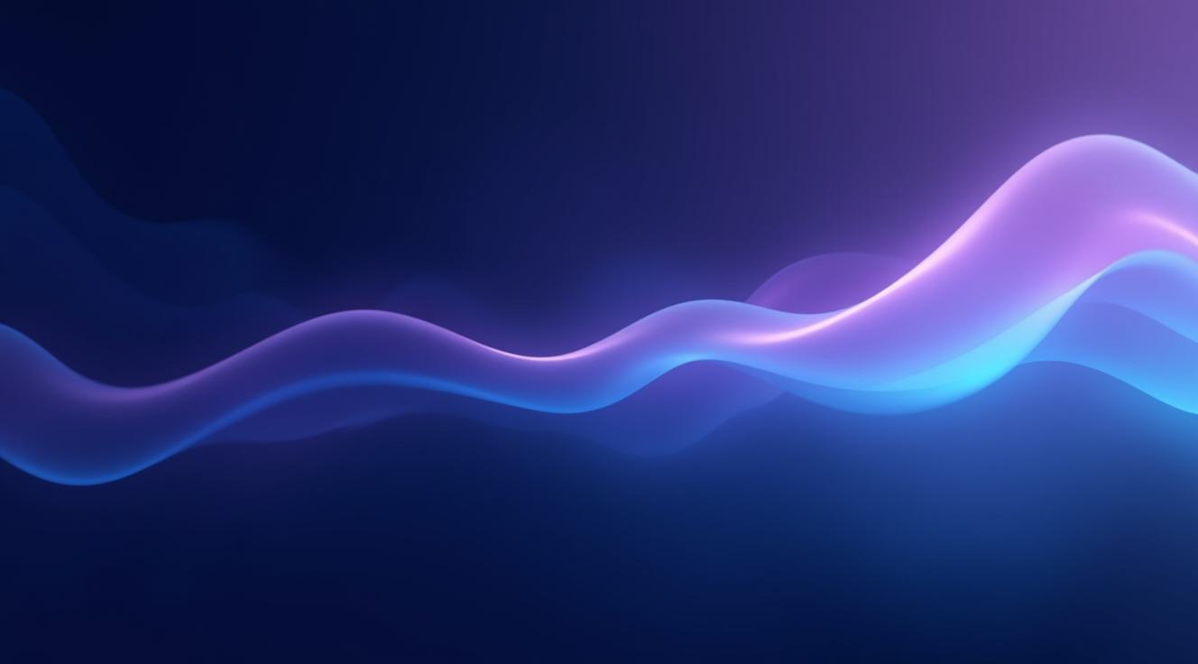 Horizontal concert ticket background, abstract flowing sound waves on the right side, smooth audio wave patterns in soft gradient from deep blue to lavender, left side empty dark space for text, minimalist design, neutral background suitable for all ages, professional studio quality, subtle bokeh effects, atmospheric lighting, aspect ratio 1:2