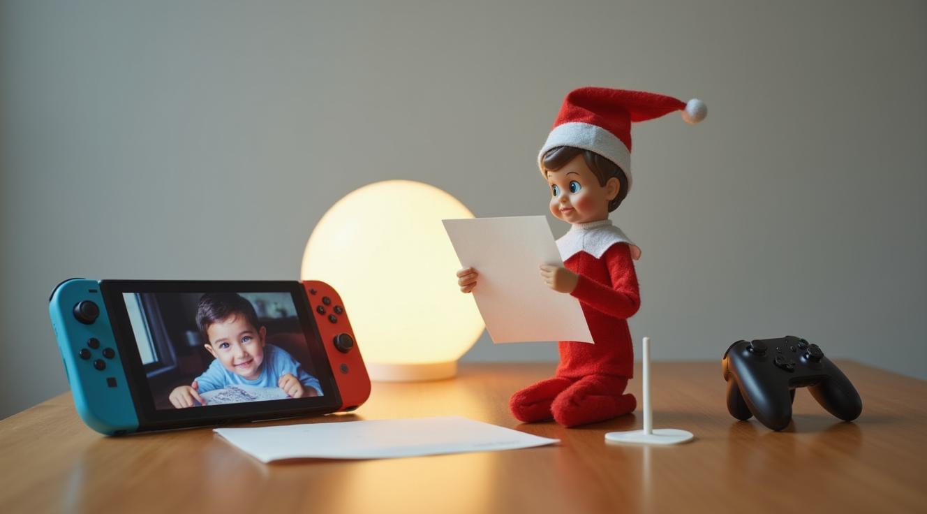clean symbolic scene, a thoughtful christmas elf standing between two objects making a decision, holding open papers with a child photo inside, looking uncertain, on one side a modern game console softly glowing, on the other side a simple plunger humorously highlighted, balanced composition with the elf in the center, minimalistic toy workshop or gift storage in the background, subtle festive decorations, strong contrast between desirable and absurd choice, soft cinematic lighting, stylized, clear readable game promo illustration