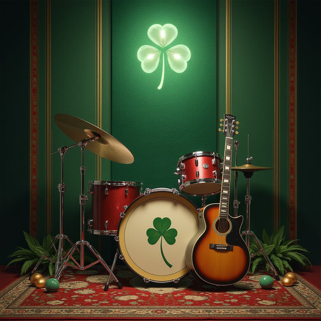 Представь мистическую сцену: гитара лес поо, словно ожившая из древних легенд, бережно обвивает магическую барабанную установку. Клевер сияет, как драгоценный камень, в его центре на большом барабане нарисован стакан. Тёмно-зелёный фон и красные орнаменты создают атмосферу древнего мира. Вокруг композиции — россыпь сухих листьев и медиаторов, будто зачарованных магией. Стиль — смесь ар-деко и фэнтези, с акцентом на блеск и загадочность.