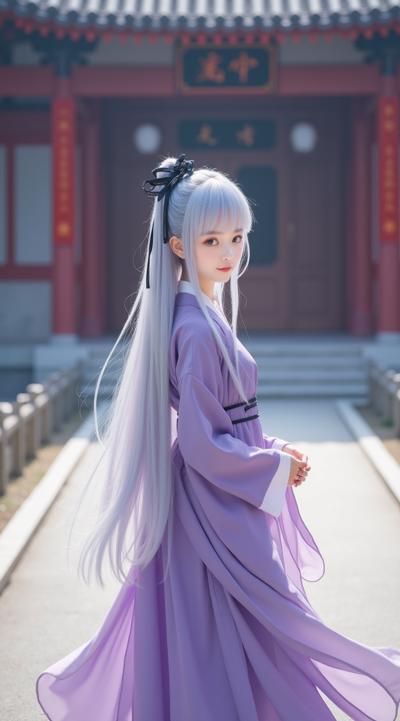 "Beautiful girl with silver hair, purple eyes, and fair skin, wearing a black ribbon in her hair and a flowing lavender hanfu. She is standing in front of an ancient Chinese palace, elegant and majestic atmosphere, traditional architecture, soft natural lighting, detailed and cinematic style, highly detailed, realistic yet artistic.",