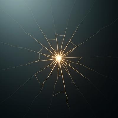 Разбитое стекло крупным планом, трещины образуют узор паутины, через одну из трещин пробивается тёплый золотистый свет. Атмосфера холодного стекла и мягкого сияния. Фон тёмно-серый с оттенком синего, акцент только на свете в трещине. Минималистично, кинематографично, мягкая зернистость. Без людей, только текстуры стекла и свет.