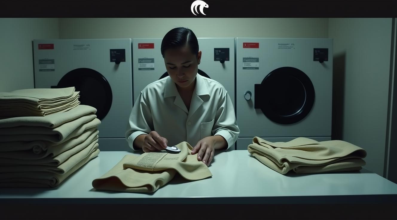 moody prison laundry scene, a worker sitting at a table sorting neatly folded prison uniforms, holding a sharpened toothbrush or hidden note discovered inside the clothes, looking uncertain, calm repetitive workspace with piles of fabric, labels, iron and baskets, industrial washing machines and metal interior in the background, dim cold lighting with soft shadows, subtle tension breaking a peaceful routine, cinematic composition, grounded realistic style with slight stylization, detailed environment, atmospheric game promo illustration