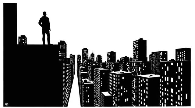 Noir comic book illustration in stark black and white contrast, graphic novel style. Wide cinematic shot. A man stands with his back to the viewer on the rooftop of a tall building, overlooking a bleak city filled with endless rows of panel apartment blocks. The streets below glow faintly with streetlights, casting long dramatic shadows. The man’s figure is silhouetted against the urban sprawl, his posture tense and heavy, embodying loneliness and determination. Strong shadows, sharp ink lines, high-contrast lighting, gritty noir atmosphere, wide composition emphasizing the oppressive cityscape