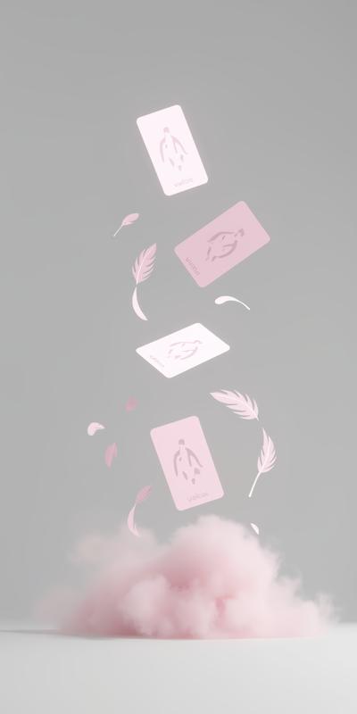 Hyper-realistic studio photo of tarot cards floating in the air, with tiny pink feathers flying in the air and smoke scattered everywhere. A clean, even light gray background, soft diffused lighting with the addition of pink bright LED lights, a clear focus on texture and finish, luxurious technical editorial aesthetics, and photographic style.