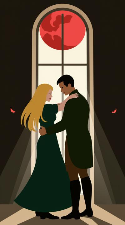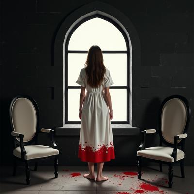 Medieval setting. A beautiful hall of a castle made of black stone, furnished with furniture. A woman stands at the window/sill with her back to us. We can only see her back, wearing a white nightgown with red paint splatters at the bottom. We see her brown hair and bare feet with red splatters. She stands by the window. The sky and clouds are visible outside. It's morning, with sun rays streaming into the hall.