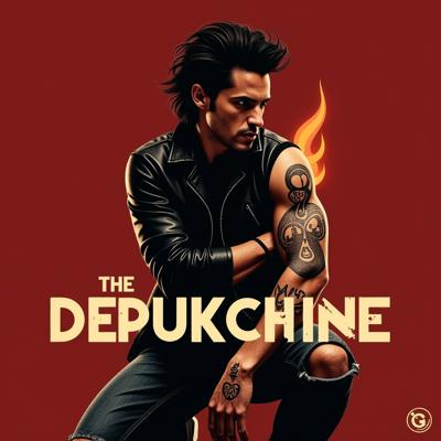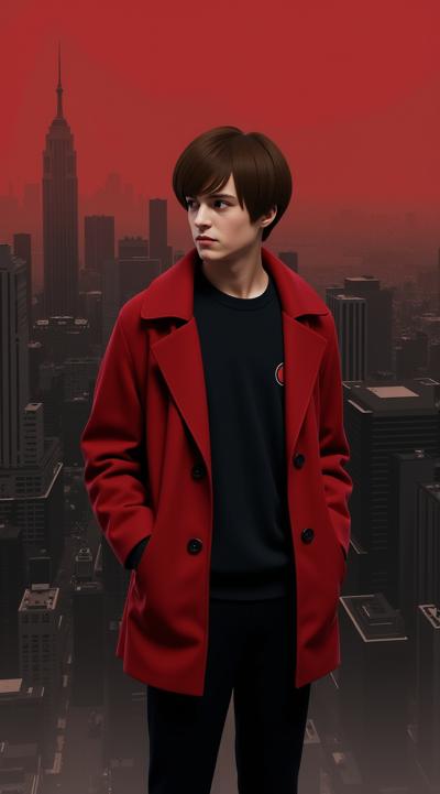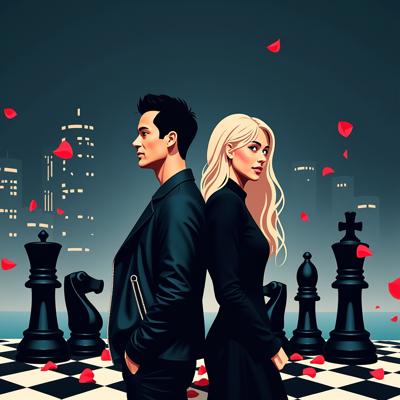 красивый парень в кожаной куртке и девушка блондинка с длинными волосами, смотрят в сторону, стоят боком спина к спине, стоят на огромной шахматной доске, фон высотки ночного города и огромные черные шахматные фигуры, алые розы, лепестки роз в воздухе,переливающиеся холодные тона, Иллюстрация, реализм, высокая детализация