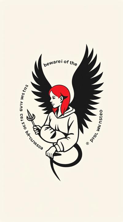 Эскиз для вышивки на толстовке. Девушка ангел с рыжими волосами, чёрные крылья, демонический хвостик не как у животного с треугольничком на конце, рожки, в руке трезубец. демоническая ухмылка. Надпись "Осторожно злой хозяин" латинский алфавит, начало сверху продолжение снизу. В руке поводок от ошейника собаки, рядом собака сидит породы хаски русого оттенка. Одета в короткий топик и шортики. Вызывает страх.