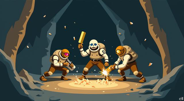 cooperative time-traveler scavengers exploring an abandoned location, three rugged players in mixed futuristic scavenger gear smashing environmental objects and collecting glowing resources, debris flying through the air, environment blending timelines: prehistoric cave walls with ancient paintings merging into a futuristic abandoned station interior, broken structures and scattered loot, one player breaking a stone relic with a glowing tool while another gathers floating resources, distant extraction time portal glowing with a red Mars landscape inside, dusty atmosphere, cinematic lighting, dynamic action, sci-fi scavenger aesthetic, detailed environment, wide angle, game key art