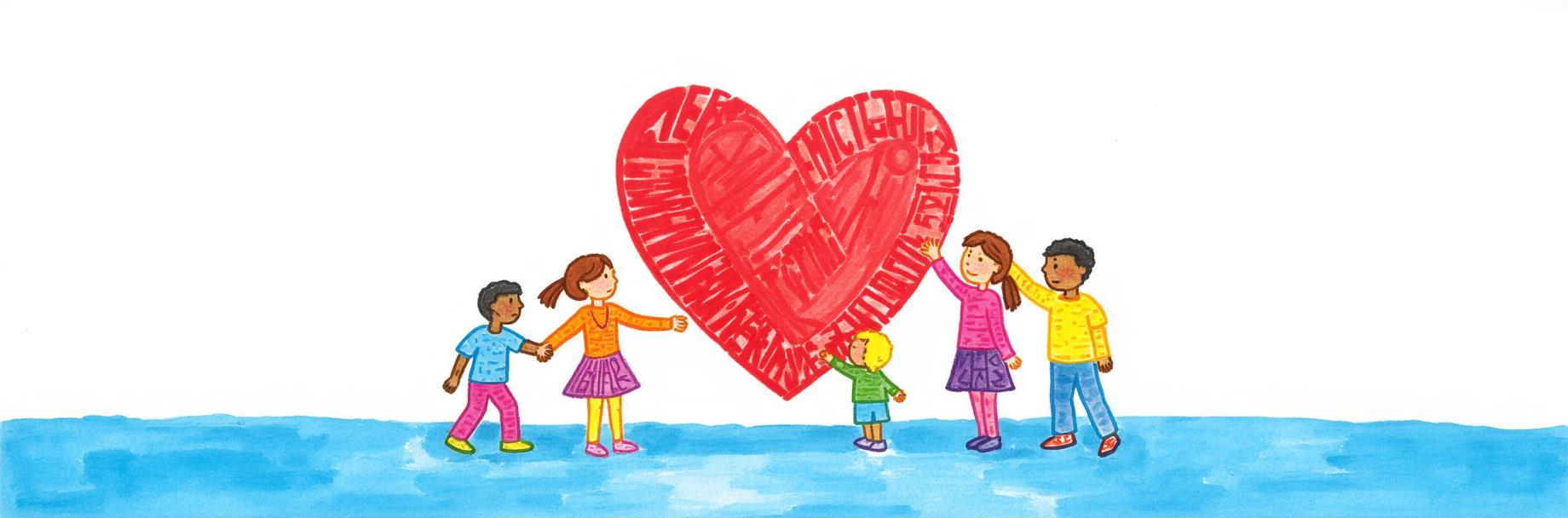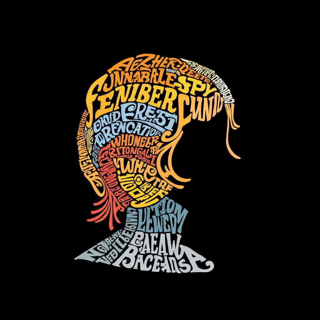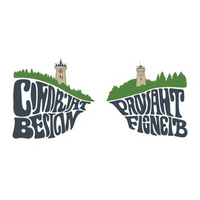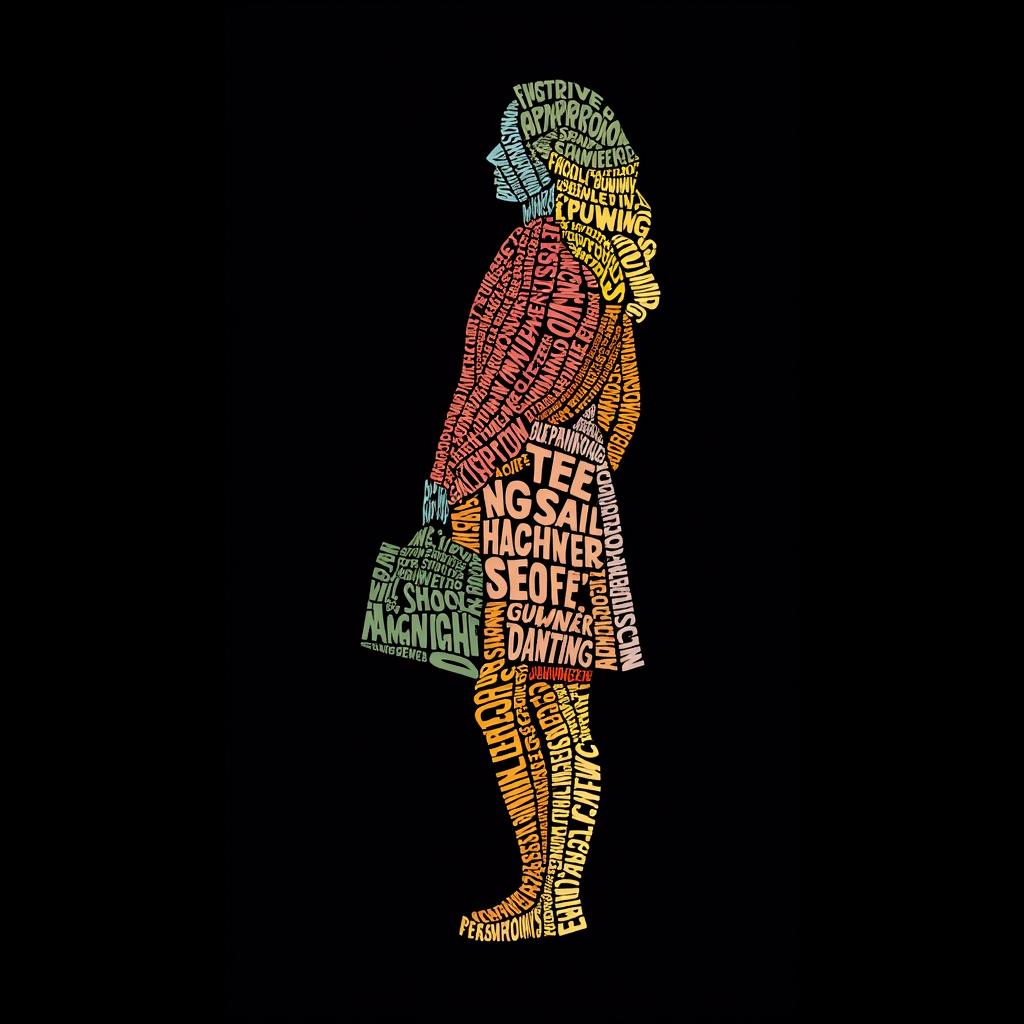 Реалистичное рисованное изображение дворца творчества и спорта "Пионер" в стиле Сталинского ампира канареечного цвета. Здание окружают надписи красного цвета в стиле леттеринга: творчество, танцы, песни, спорт, краеведение, КВН, патриотизм, педагогика, технические виды спорта, детство, смелость, мышление, креатив, радость, наука, будущее