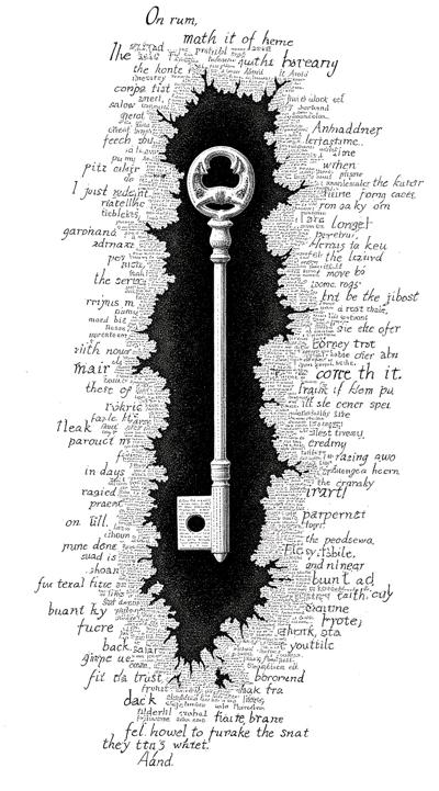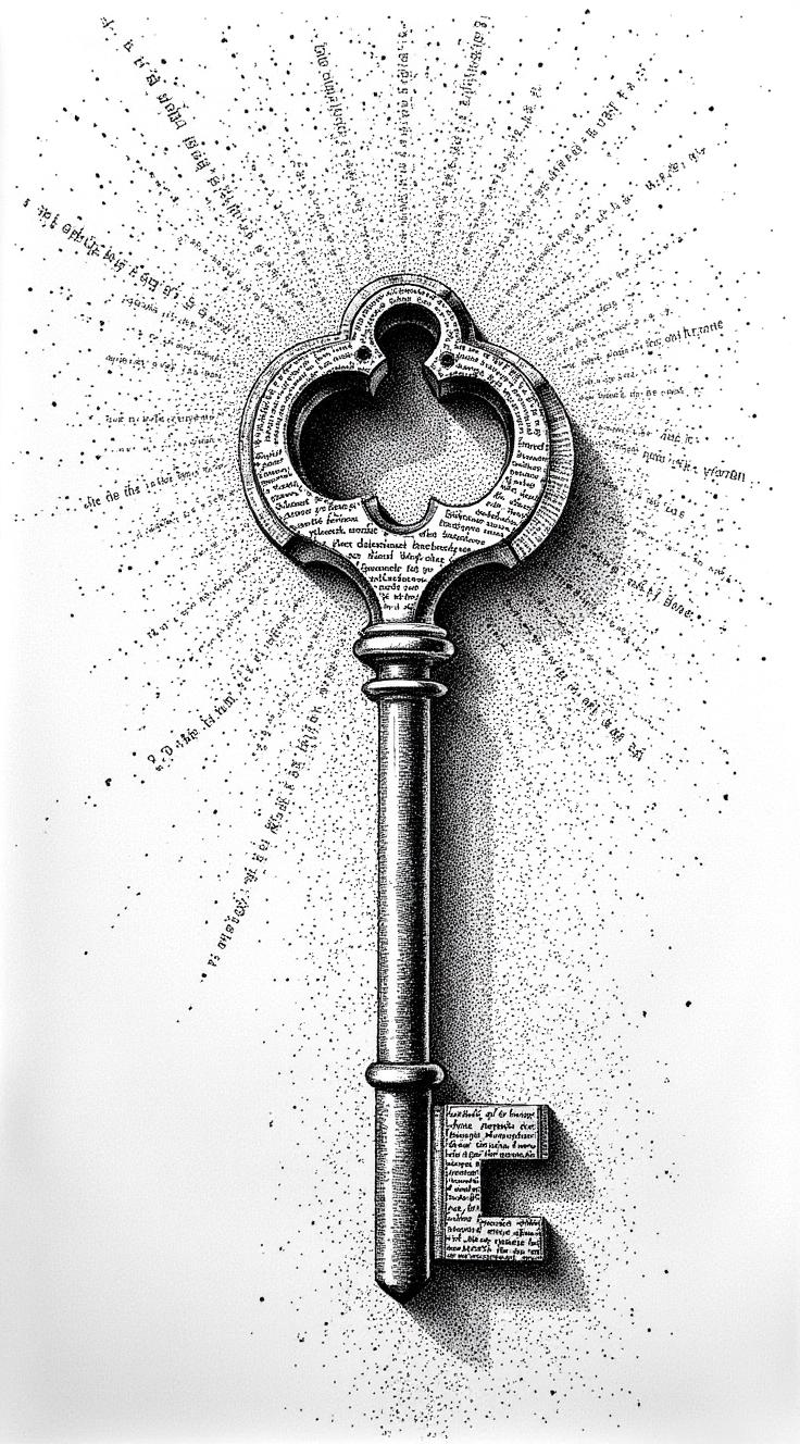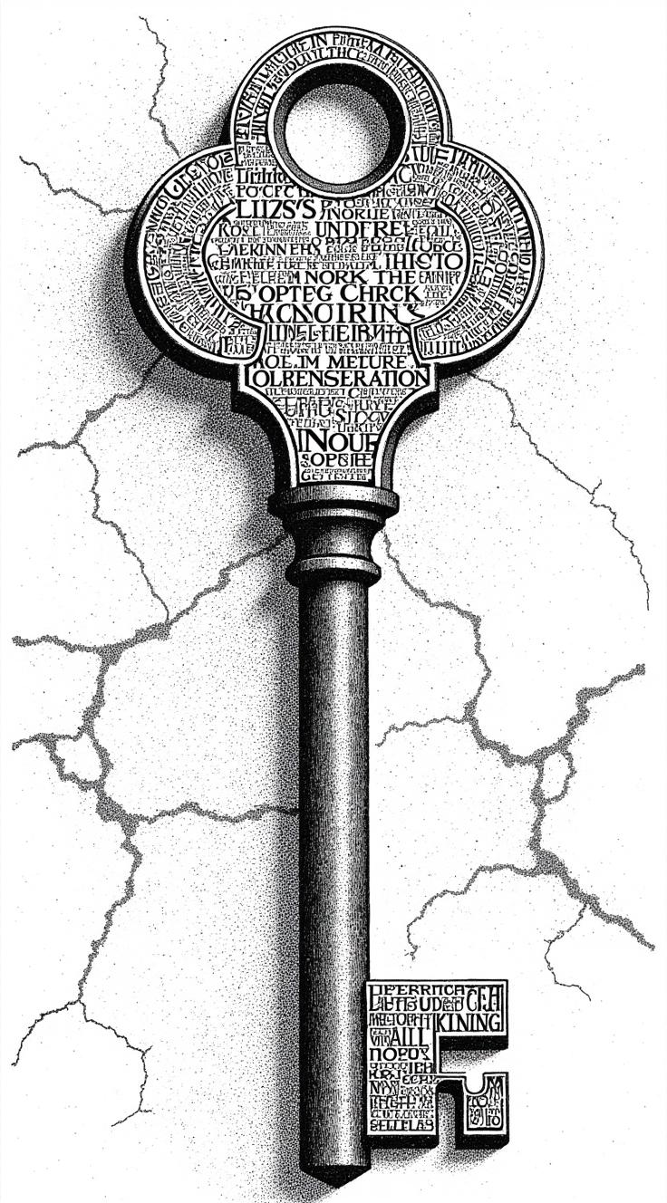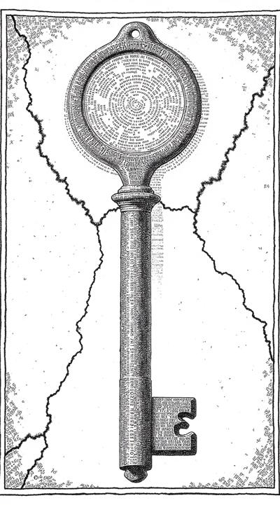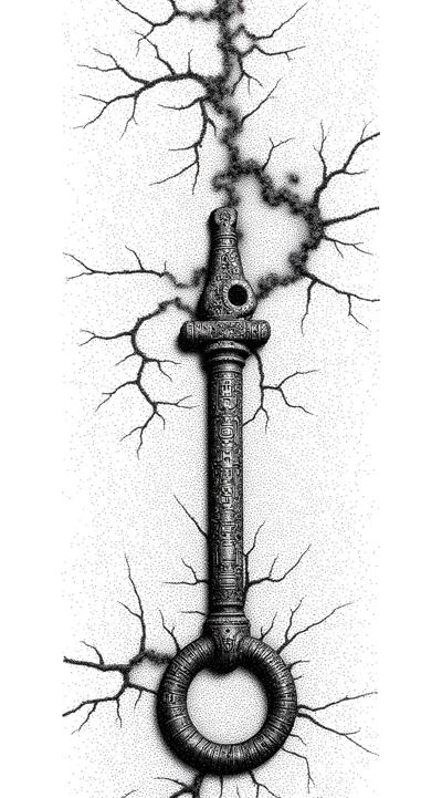 книжная иллюстрация, высокая детализация, черно-белая, стиль Альбрехта Дюрера, викторианская готика, высокая контрастность, старая оштукатуренная стена в полумраке, мощный стальной ключ вбит в штукатурку до половины своей длины, от ключа по стене во все стороны расходятся глубокие трещины в штукатурке, словно от сильного удара, некоторые трещины тянутся до края изображения, штукатурка местами осыпалась, обнажив кирпичную кладку под ней, свет падает сверху слева, подчеркивая рельеф трещин и блеск стали ключа, атмосфера необратимости, разрушения и бесповоротного решения, минимализм, символизм