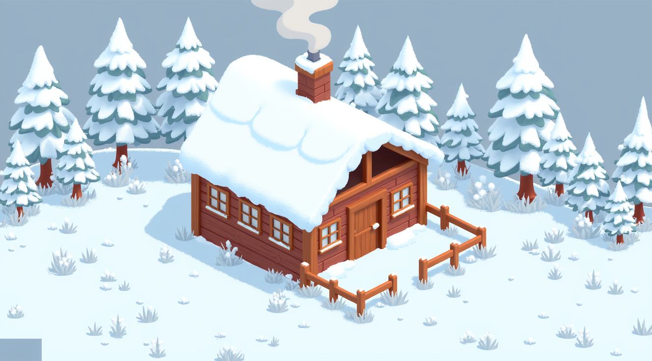 A pixel art illustration depicts a solitary wooden hut nestled within a snowy taiga forest. The hut has a steeply pitched roof covered in snow and a single smoking chimney, rendered with large, visible pixels and a limited palette of ten colors including shades of white, gray, blue, and brown. Above, a twilight sky displays a gradient of deep indigo and violet, using dithering techniques to create smooth transitions between colors. Sparse pine trees stand silhouetted against the dusky sky, enhancing the remote, medieval atmosphere of the Komi Republic.