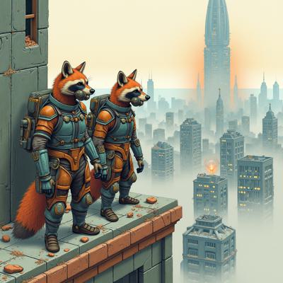 Стиль акварель гуашь , Антропоморфные сталкеры — енот и лис, в броне и с противогазами, стоят на краю разрушенной крыши высотного здания. На горизонте виден искаженный пейзаж города. Вдали, среди руин, светится странная, пульсирующая аномалия. Легкий туман или смог окутывает горизонт. Стиль: детализированный арт компьютерной игры в жанре выживания/постапокалипсиса, четкие толстые черные контуры, приглушенная серо-голубая палитра с ярким, но неестественным свечением аномалии. Выраженные текстуры разрушенных крыш и стен. Глубокие тени, подчеркивающие масштаб и опасность."