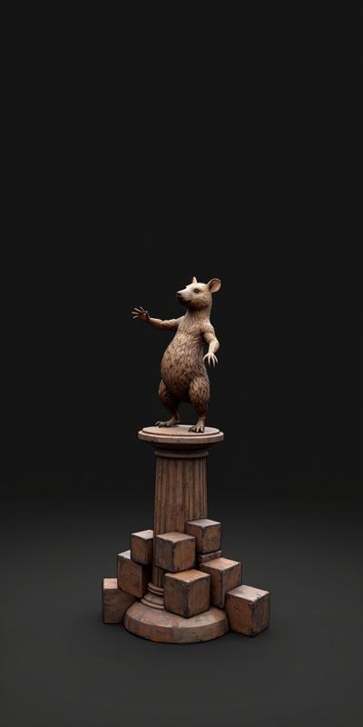 На тёмном фоне Бронзовая скульптура. Вместо постамента сваленные в кучу кубики. На вершине кучи кубиков на задних лапах стоит вомбат, одна его лапка поднята вверх.