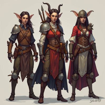 Девушки гоблины. Отряд из трёх разбойниц. Разные динамичные позы. Кожаные доспехи