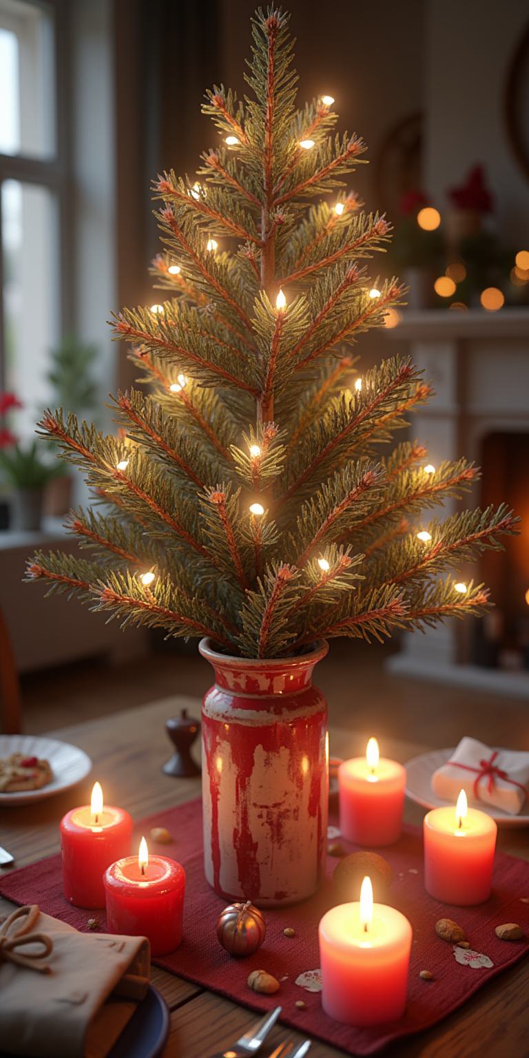 живые веточки ёлки пушистые в вазе на столе новогодние свечи
