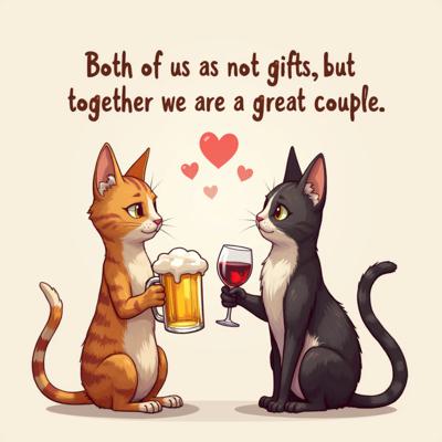 Сидят два кота друг на против друга. Один из них с кружкой пива, а второй с бокалом вина . Над ними фраза: оба мы не подарочки , а вместе отличная парочка