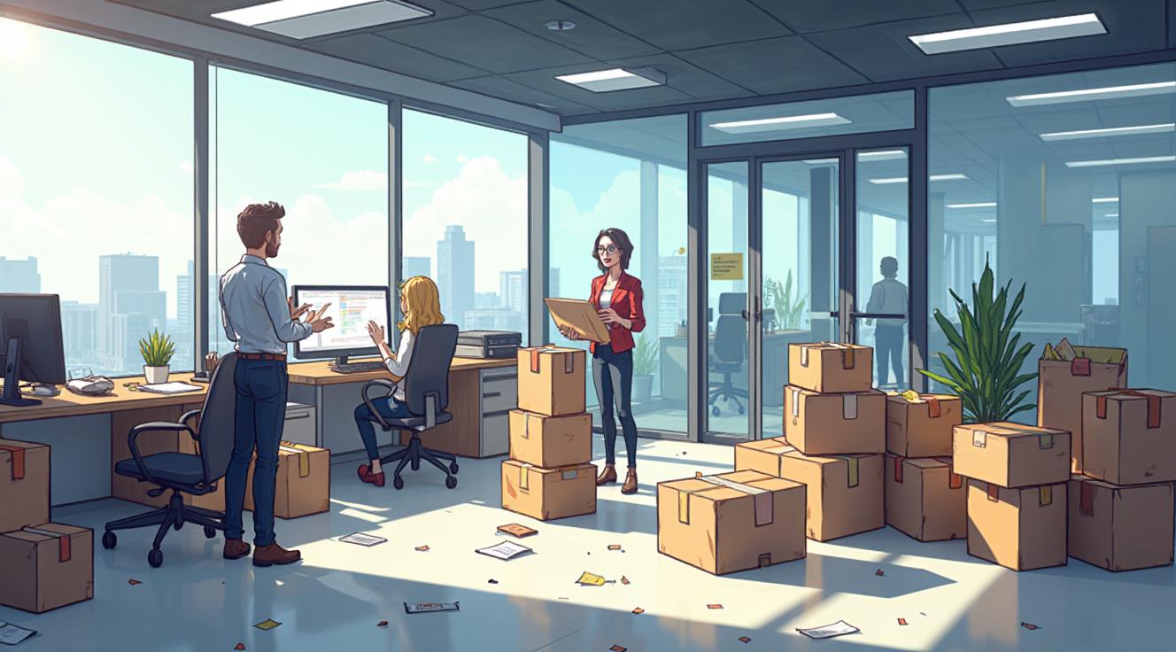 массовые увольнения. большой офис, стеклянные стены. творится хаос. кто-то пакует свои вещи с рабочего стола в коробки, кто-то спорит с менеджром, кто-то уже грустный уходит к лифтам. ракурс немного сверху