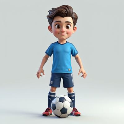 Футболист с мячом мальчик европейской внешности в полный рост, в синей футболке, без фона