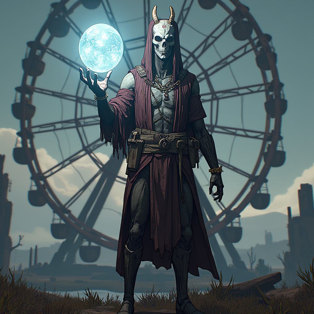 Персонаж вселенной сталкер группировки монолит с артефактом в руке на фоне колёса обозрения