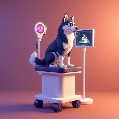 изображение хаски на узи в больнице в мультяшном стиле в 3D, фон в оранжевых и фиолетовых тонах,
