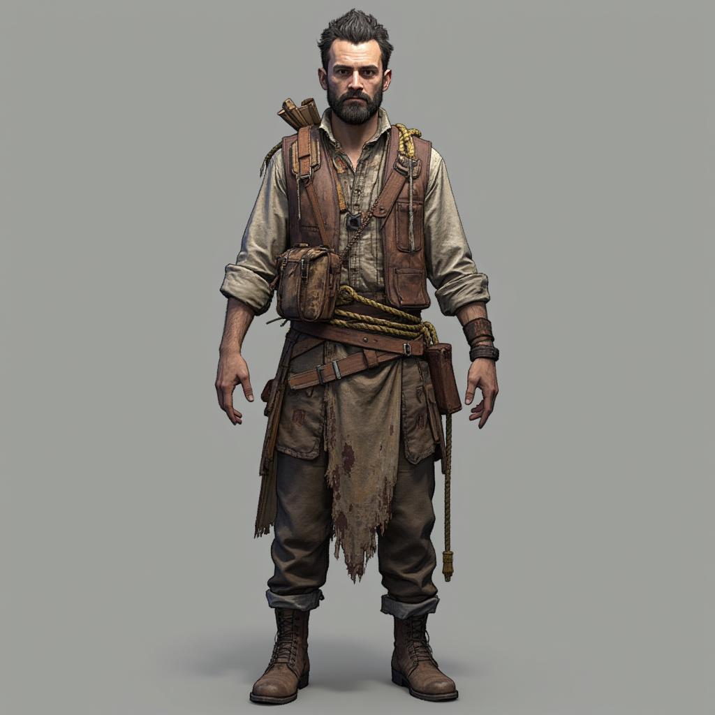 3д модель парня в стиле пост апокалипсис, на нём самодельная одежда из тряпок и верёвок, нужно проработать эту одежду. одежда похожа на лохмотья, потрёпанная и самодельная. не похожа на нормальную одежду