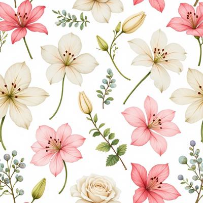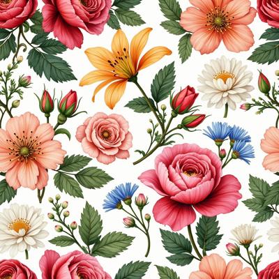 Seamless repeating floral pattern. Rich mix of detailed colorful flowers: peonies, roses, lilies, asters, Chrysanthemum, Cream Rose, Carnation, White Alstroemeria. Lush green leaves, delicate buds, swirling vines. Intricate details, vibrant but harmonious colors, painterly style, perfect for wallpaper or textile. Seamless tile, no visible edges, high detail.