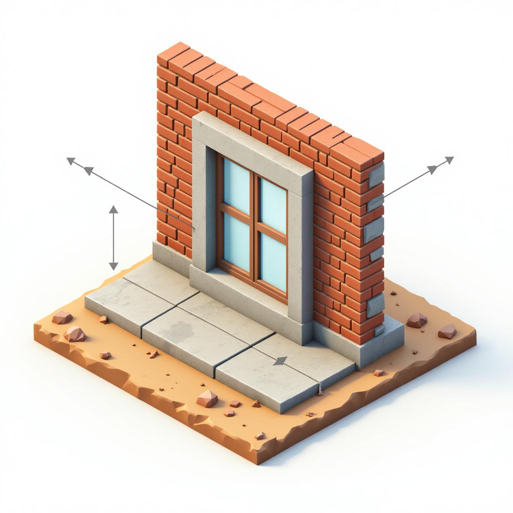 Создай иллюстрацию - схему стены здания из кирпича с оконным проёмом над которым установлена железобетонная перемычка. Покажи, как перемычка передаёт нагрузку, чтобы кирпичи над окном не провалились в нишу окна, а держались за счёт перемычки.. Используй простые направления, чтобы показать направление силы: давление сверху вниз → разворот по перемычке → передаётся на боковые стены. Стиль: профессиональная архитектурная схема, изометрический или боковой вид, мягкий утренний свет, светло-серые и бежевые тона, белый фон. Без текста, без людей, без лишних деталей. Высокая детализация, векторный стиль, подходит для строительных специалистов.