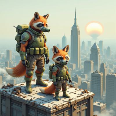 Стиль акварель гуашь , Антропоморфные сталкеры — енот и лис, в броне и с противогазами, стоят на краю разрушенной крыши высотного здания. На горизонте виден искаженный пейзаж города. Вдали, среди руин, светится странная, пульсирующая аномалия. Легкий туман или смог окутывает горизонт. Стиль: детализированный арт компьютерной игры в жанре выживания/постапокалипсиса, четкие толстые черные контуры, приглушенная серо-голубая палитра с ярким, но неестественным свечением аномалии. Выраженные текстуры разрушенных крыш и стен. Глубокие тени, подчеркивающие масштаб и опасность."