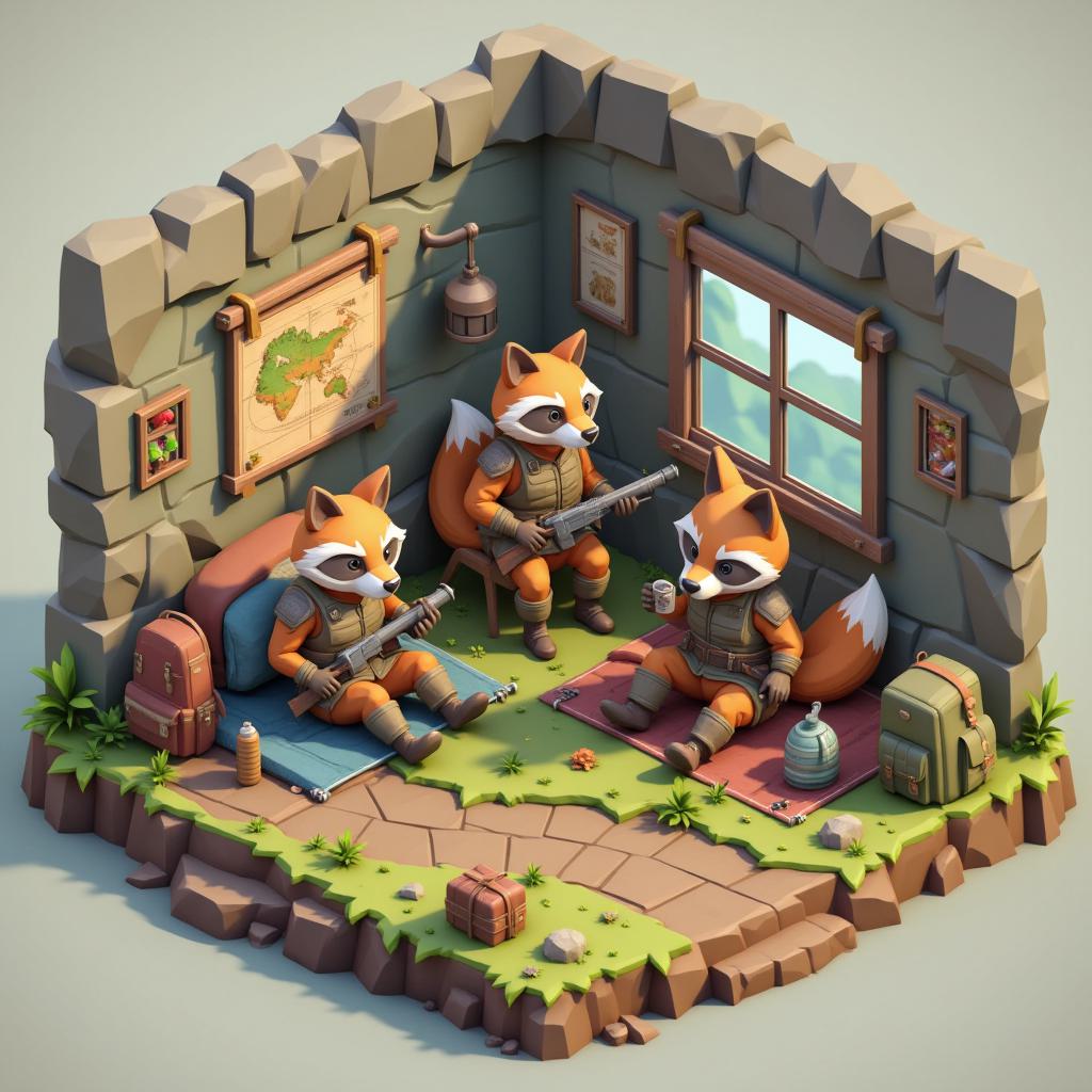 Антропоморфные сталкеры — енот и лиса, с человеческими фигурами, одетые в поношенную броню, отдыхают в небольшом убежище. На стене висит самодельная карта, на полу — спальный мешок и рюкзаки. Из единственного окна пробивается тусклый дневной свет. Енот чистит оружие, лис пьет из фляги. Стиль: детализированный арт компьютерной игры в жанре выживания/постапокалипсиса, четкие толстые черные контуры, приглушенная палитра (грязно-желтый, коричневый, хаки), текстуры ржавчины и потертостей. Локальное освещение, создающее тени и ощущение замкнутого пространства."
