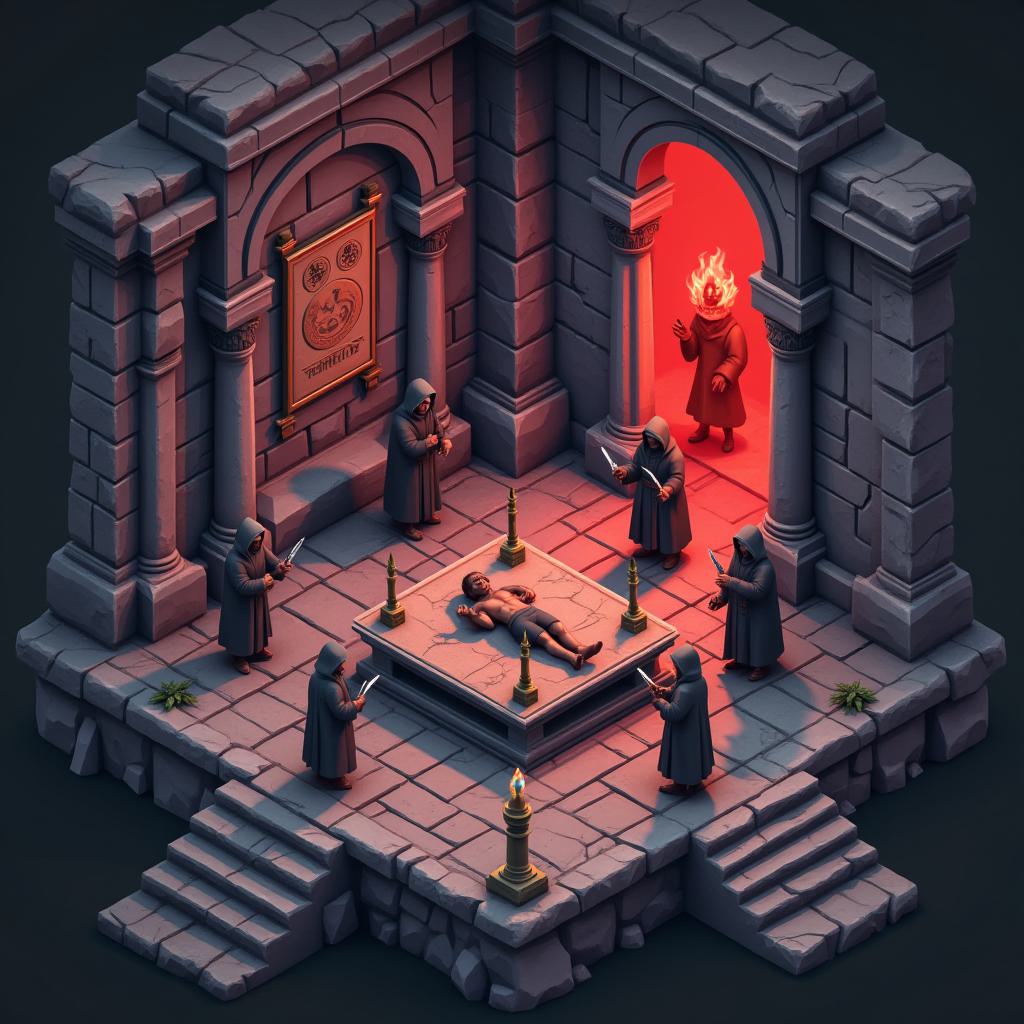 В глубине древнего, разрушенного храма, залитого зловещим багровым светом, на алтаре лежит связанная фигура. Вокруг стоят жрецы в капюшонах, поднимая ритуальные ножи. На стенах храма – древние, страшные символы. Атмосфера ужаса и неотвратимости. Стиль: пиксель арт, темное фэнтези, ритуал, храм, зловещий свет, капюшоны, мистика, высокая детализация, мрачные цвета.