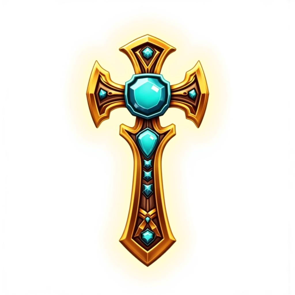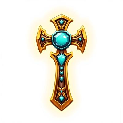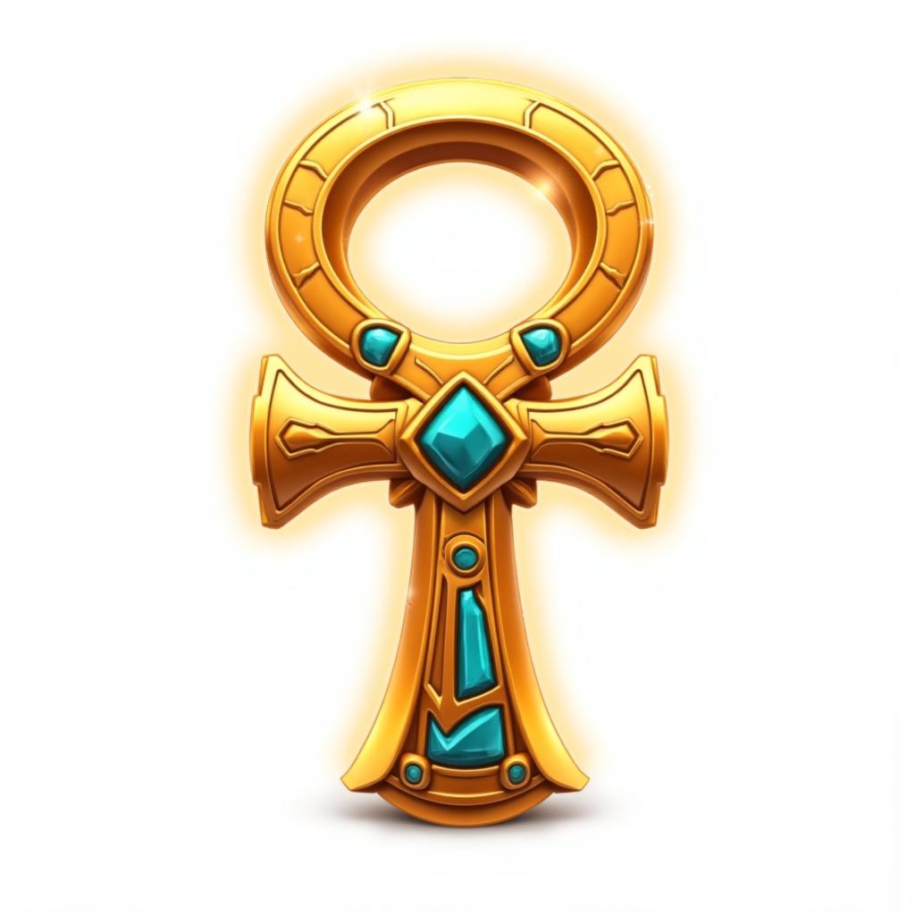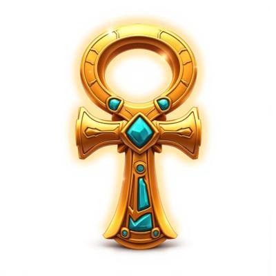 Мультяшный значок для слот-игры в виде египетского анкха (креста жизни). Символ объёмный, золотой, с декоративными узорами и сияющими акцентами. Вставки из бирюзовых и лазуритовых камней, лёгкое свечение вокруг. Стиль аккуратный и яркий, как ювелирное украшение, с мягкими тенями и бликами. Фон прозрачный, чтобы использовать как символ на барабане.