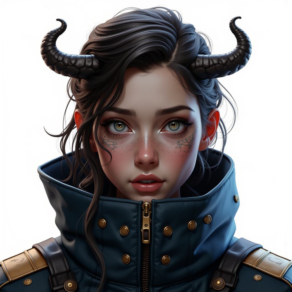 A young woman with delicate horns growing from her temples and a pattern of iridescent scales on her cheek. She is hiding behind the high collar of her coat, her gaze is frightened and full of shame. Night city in the background. Realistic photo, high detail on skin and texture, soft lighting.