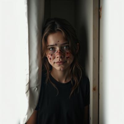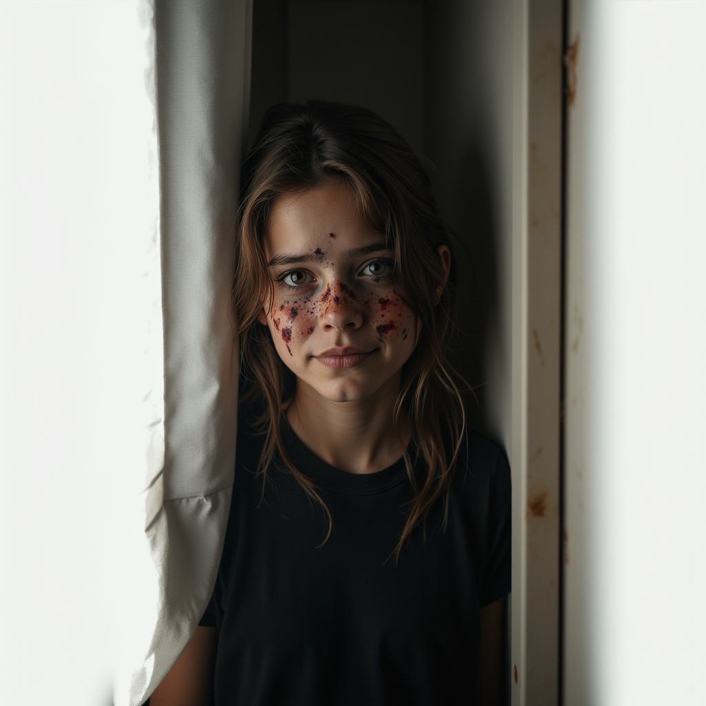 Эмоциональное фото девушки-мутанта 14 лет, которая пытается спрятать свою мутацию. Она сжимается в углу комнаты, свет из окна падает на ее лицо, полное печали и стыда. Гиперреализм, атмосферно.