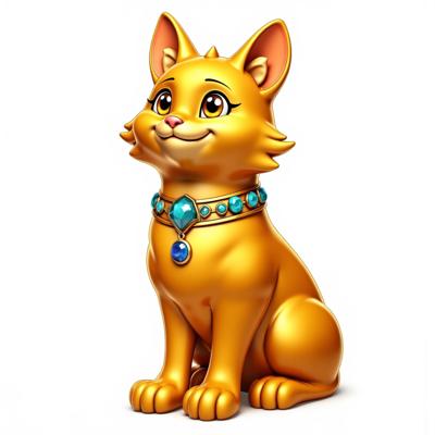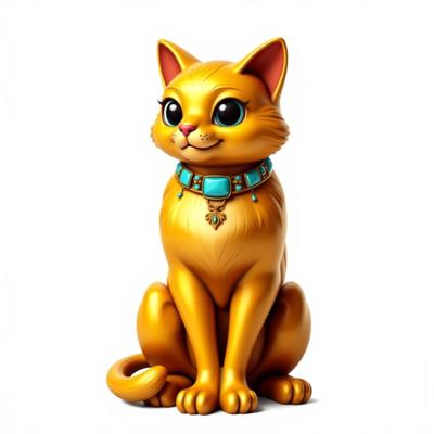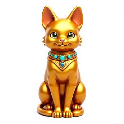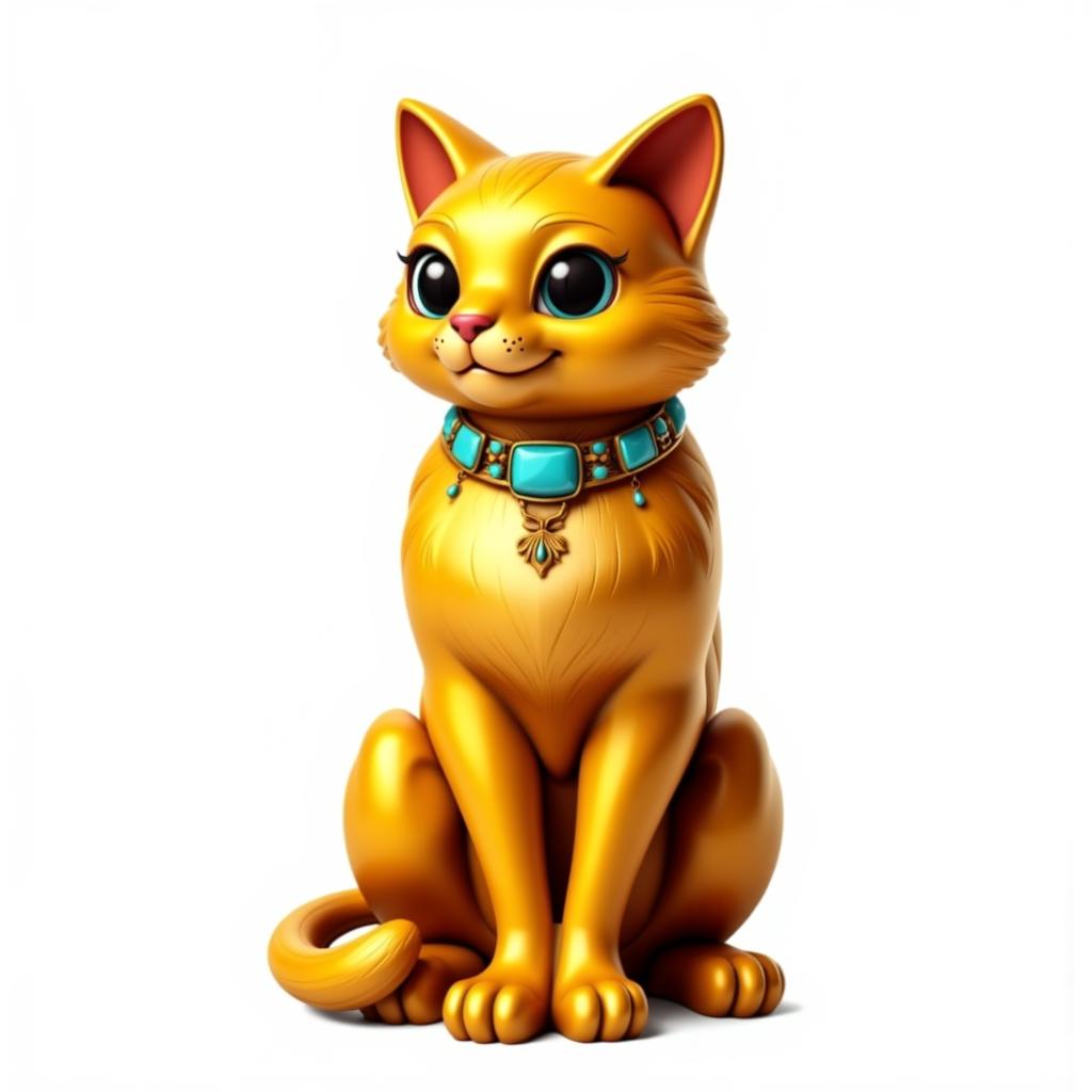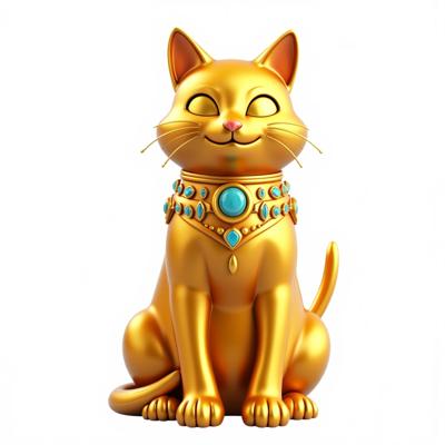 Мультяшный значок для слот-игры в виде золотой статуэтки египетской кошки. Сидящая фигурка в стиле Бастет, сделанная из золота, как декоративная скульптура. Обязательно подчёркнуты материал и текстура — блестящее золото, ювелирные украшения из бирюзы и сапфира, декоративное ожерелье. Стиль объёмный, как маленькая фигурка-амулет, с мягкими тенями и бликами. Фон прозрачный, чтобы использовать как символ на барабане.