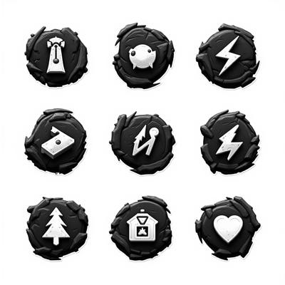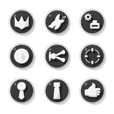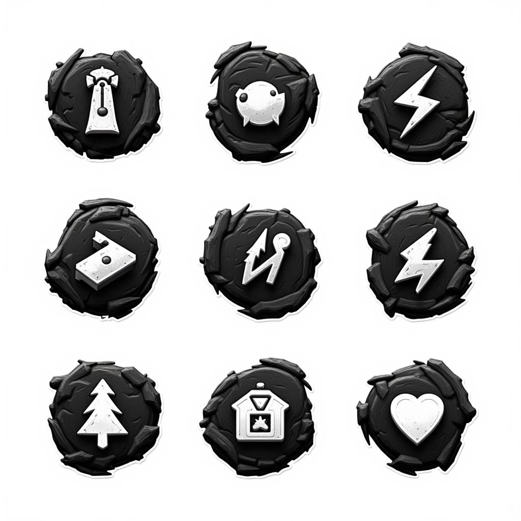 ui круглые плоские кнопки для игры, не 3d а 2d!! не мультяшные, белые, на черном фоне. Игра хоррор. Кнопка для настроек, кнопка с изображением дороги, кнопка с изображением больничной палаты, кнопка с изображением кладбища, кнопка с изображением выхода, кнопка с изображением персонажа, кнопка с изображением сердца