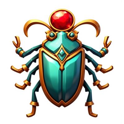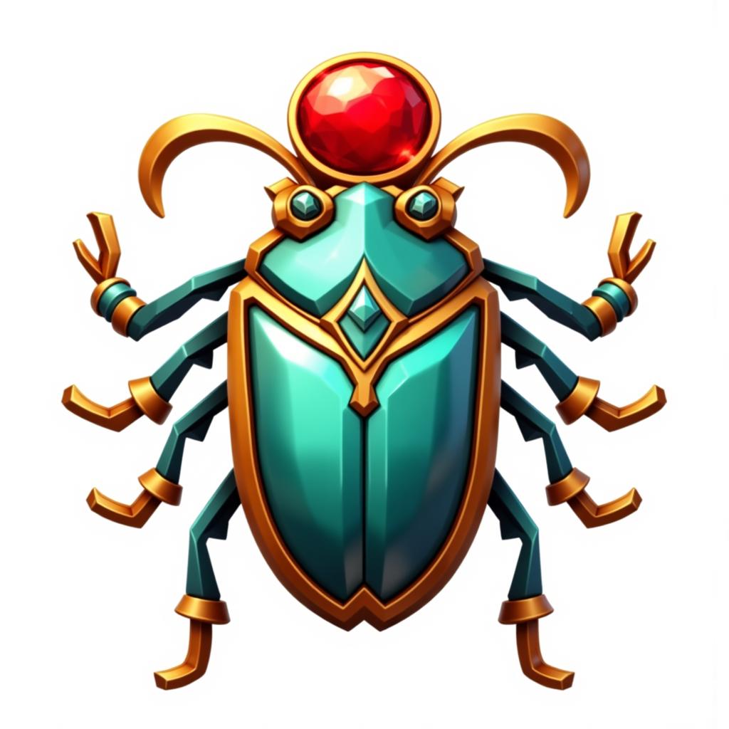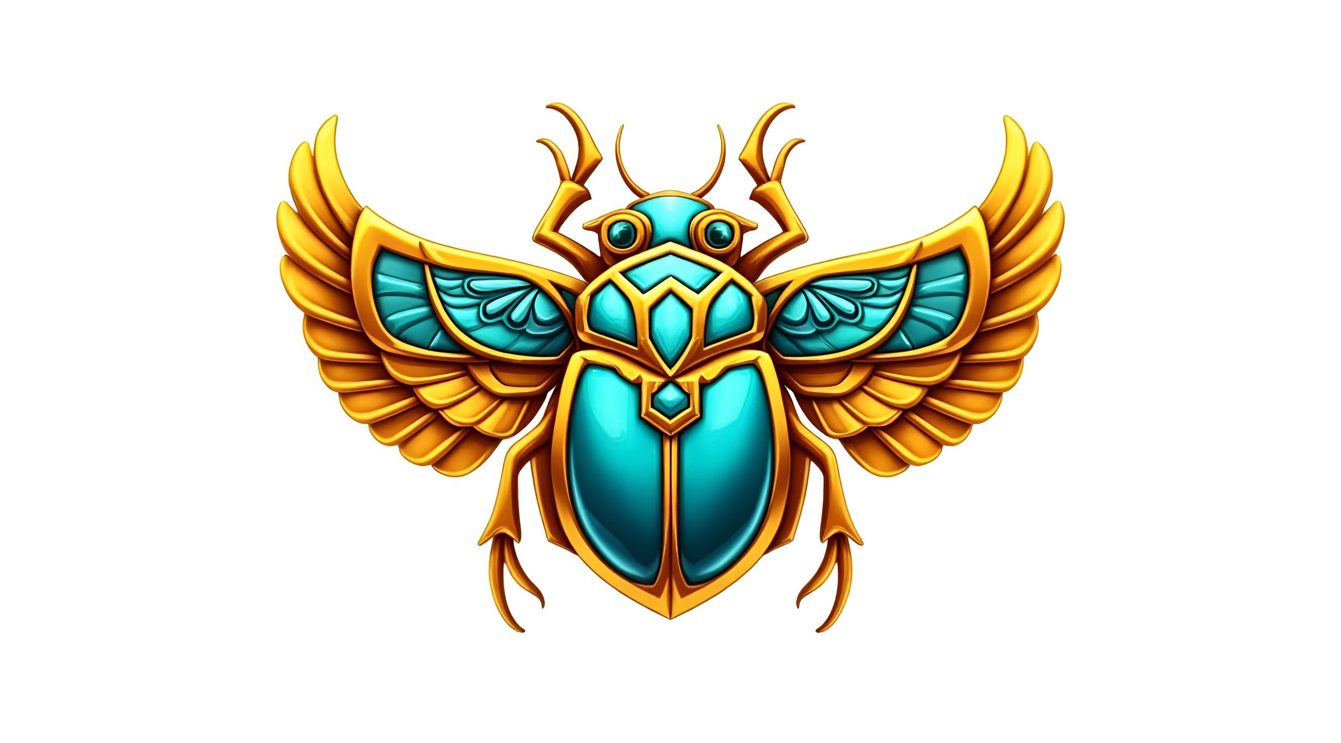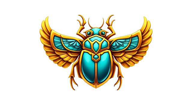 Мультяшный значок для слот-игры в виде египетского скарабея. Яркий, симметричный, с золотыми и бирюзовыми акцентами, украшенный драгоценными камнями. Объёмный, блестящий, как ювелирное украшение. Фон прозрачный, чтобы использовать как символ на барабане. Стиль аккуратный, декоративный, с лёгкими тенями для глубины.