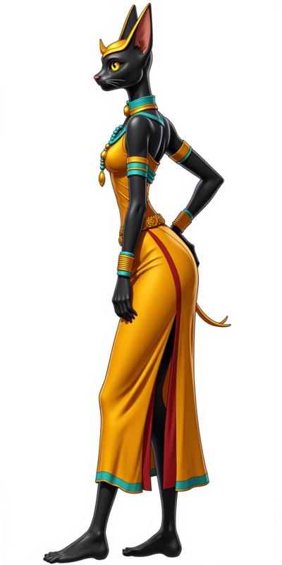 A full-body 2D cartoon Bastet, the Egyptian cat-headed goddess, in 3/4 view, slightly turned to the side. She has a sleek cat head instead of a human face and a woman’s body. She wears a golden-turquoise crown, wide beaded collar, ornate bracelets, and a golden dress with turquoise and red details. In one hand she holds a sistrum, in the other an ankh. Her cat head is regal, with stylized eyeliner. Soft, hand-drawn 2D style, bright and vibrant, perfect for a fantasy slot game. Simple or transparent background.