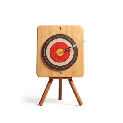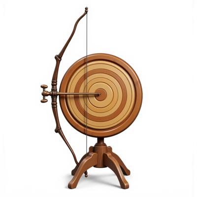 Деревянная мишень для лука на белом фоне, установленная на треногу.
