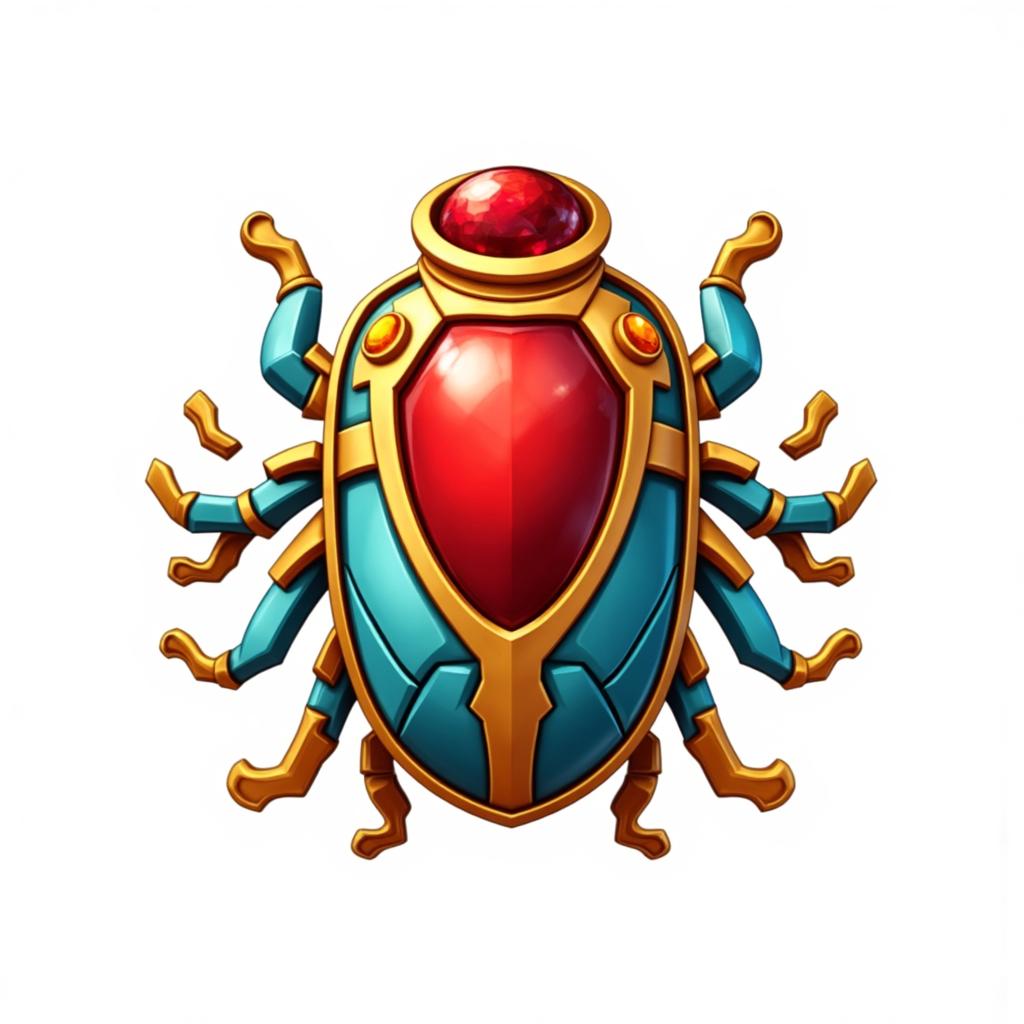 Мультяшный значок для слот-игры в виде египетского скарабея. Яркий, симметричный, с золотыми и бирюзовыми акцентами, украшенный драгоценными камнями, над головой держит круглый красный драгоценный камень. Объёмный, блестящий, как ювелирное украшение. Фон прозрачный, чтобы использовать как символ на барабане. Стиль аккуратный, декоративный, с лёгкими тенями для глубины.