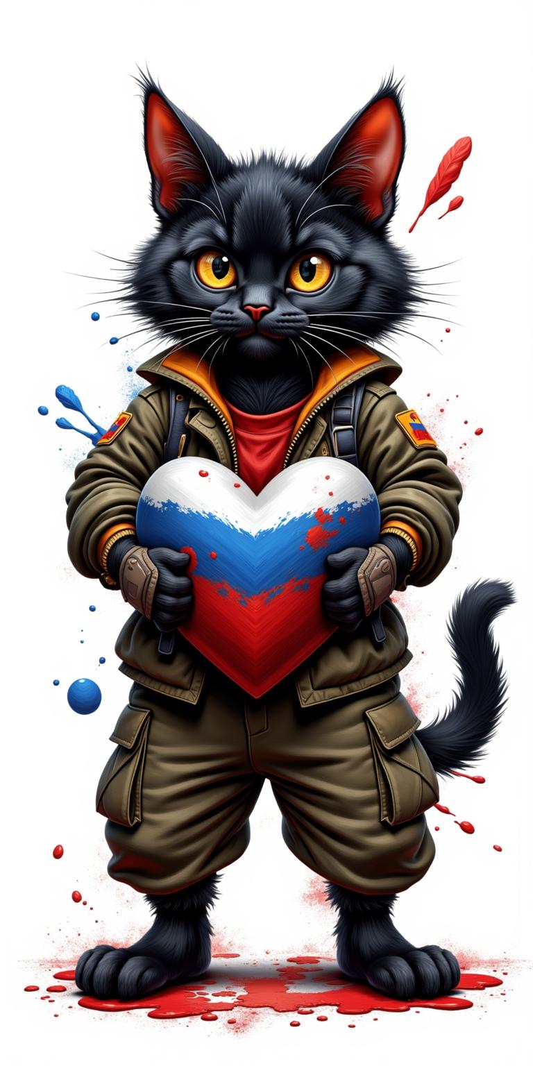 Брутальный черный кот с выраженной мускулатурой. Кот в военных штанах, на лапах — камуфляжные перчатки. Он держит перед собой сердце, раскрашенное в цвета российского триколора (белый, синий, красный), символизирующее любовь к Родине. Фон открытки — динамичный, с абстрактными брызгами краски (преобладают красный, белый и синий цвета),
