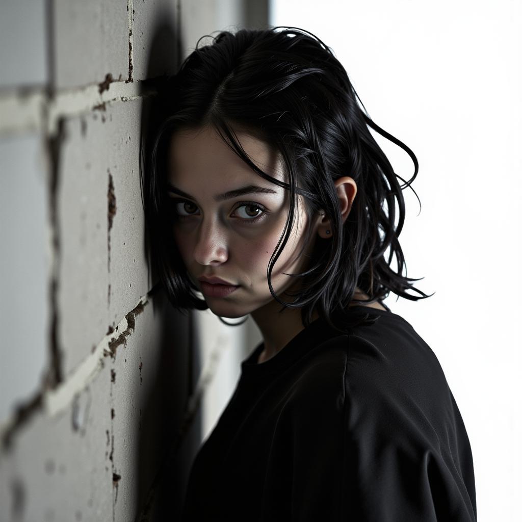 Девушка-мутант с необычной внешностью, застенчивая, прячется в тени переулка, стесняется своей мутации. Выразительные глаза, эмоциональная сцена. Фотография, кинематографичное освещение, высокая детализация.