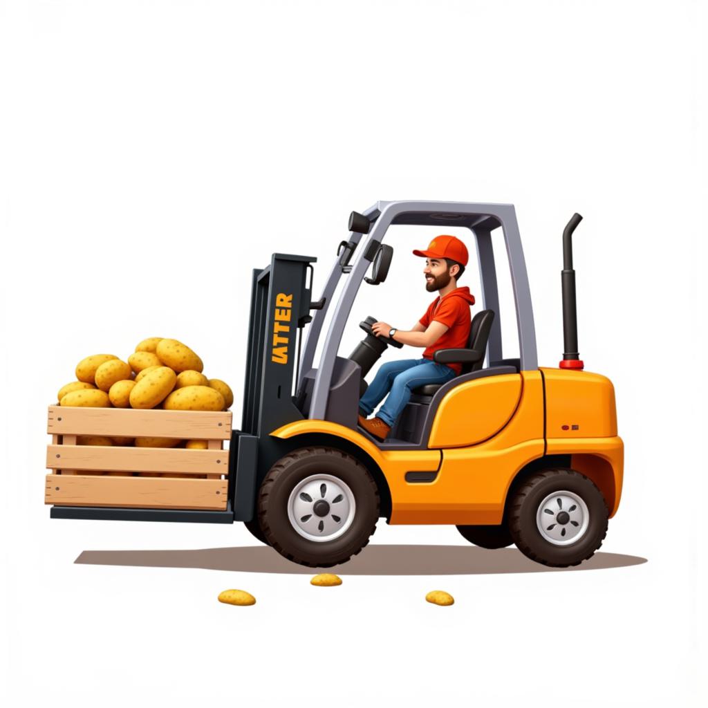 рисунок на котором нарисован милый вилочный погрузчик перевозящий ящик с картошкой