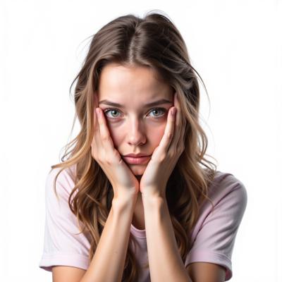 Портрет милой, но застенчивой девушки с признаками мутации (например, необычный цвет кожи или светящиеся глаза). Она отворачивается и прикрывает лицо руками, стесняясь того, кто она есть. Фотографический стиль.