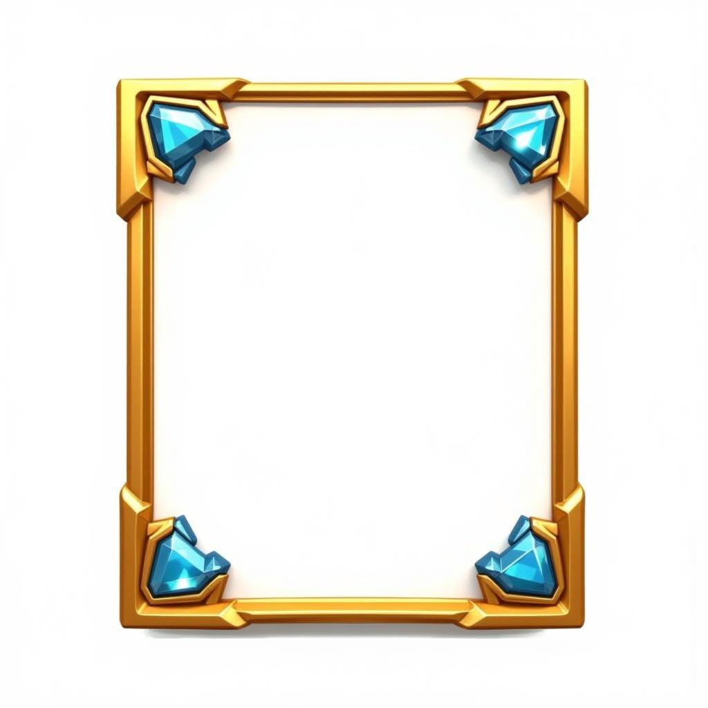 Тонкая золотая рамка для иконки слот-игры, с аккуратной геометрической огранкой по бокам, в стиле ювелирной резьбы. Минималистичный мультяшный стиль, яркое блестящее золото с мягким сиянием. Дизайн изящный, элегантный и легко читаемый, подходит для мобильной игры. По краям голубые алмазы в тонких рамочках. Внутри рамки пустое пространство для символа. Фон прозрачный