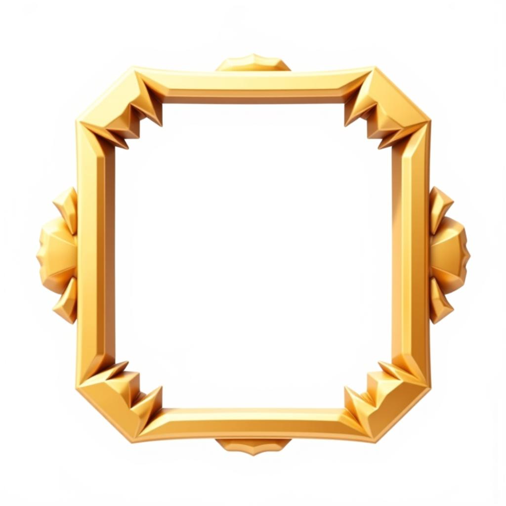 Тонкая золотая рамка для иконки слот-игры, с аккуратной геометрической огранкой по бокам, в стиле ювелирной резьбы. Минималистичный мультяшный стиль, яркое блестящее золото с мягким сиянием. Дизайн изящный, элегантный и легко читаемый, подходит для мобильной игры. Внутри рамки пустое пространство для символа. Фон прозрачный