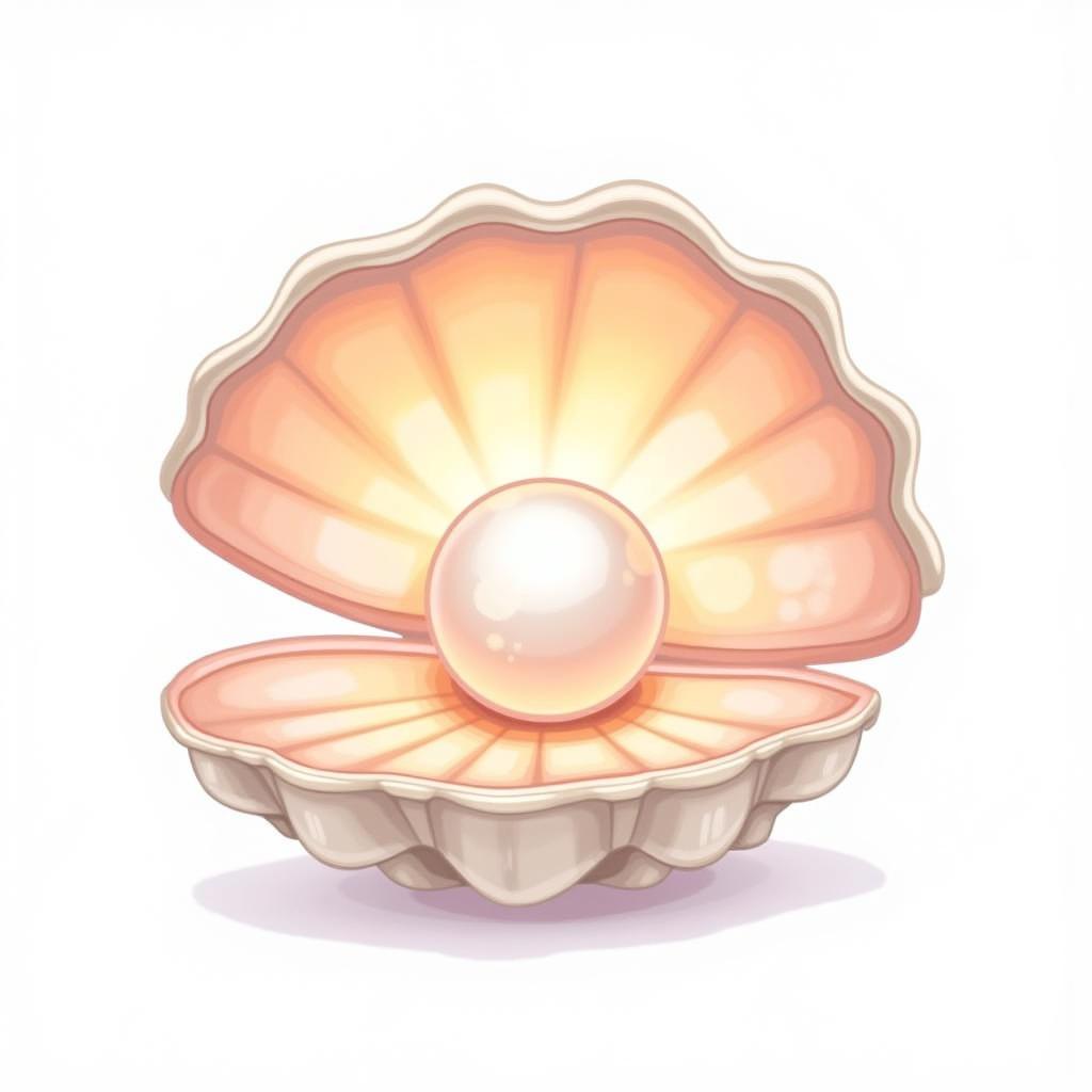 Иконка раскрытой морской ракушки в казуальном мультяшном стиле. Ракушка перламутровая, с мягким розово-золотистым отливом, раскрыта широко. Внутри сияет большая круглая жемчужина с мягким светящимся блеском. Вокруг жемчужины лёгкое свечение, создающее магическое ощущение ценности. Стиль мультяшный, яркий и дружелюбный, с полированным видом и насыщенными цветами. Дизайн легко читаемый и идеально подходящий для слот-игры. Фон прозрачный.