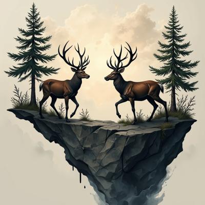 В представленном картине наблюдается сочетание элементов сюрреализма, абстрактного импрессионизма и минимализма. Композиция включает образ двух напряженных, крадущихся ОЛЕНЯ, расположенных на фрагменте утёса, на фоне ветки сосны. Цветовая палитра ограничена и выдержана в чёрных, серых, светло-коричневых и охровых тонах, что подчёркивает сдержанность и лаконичность стиля, характерного для минимализма, при этом сохраняя эмоциональную глубину и загадочность, присущие сюрреализму и абстрактному импрессионизму. ,